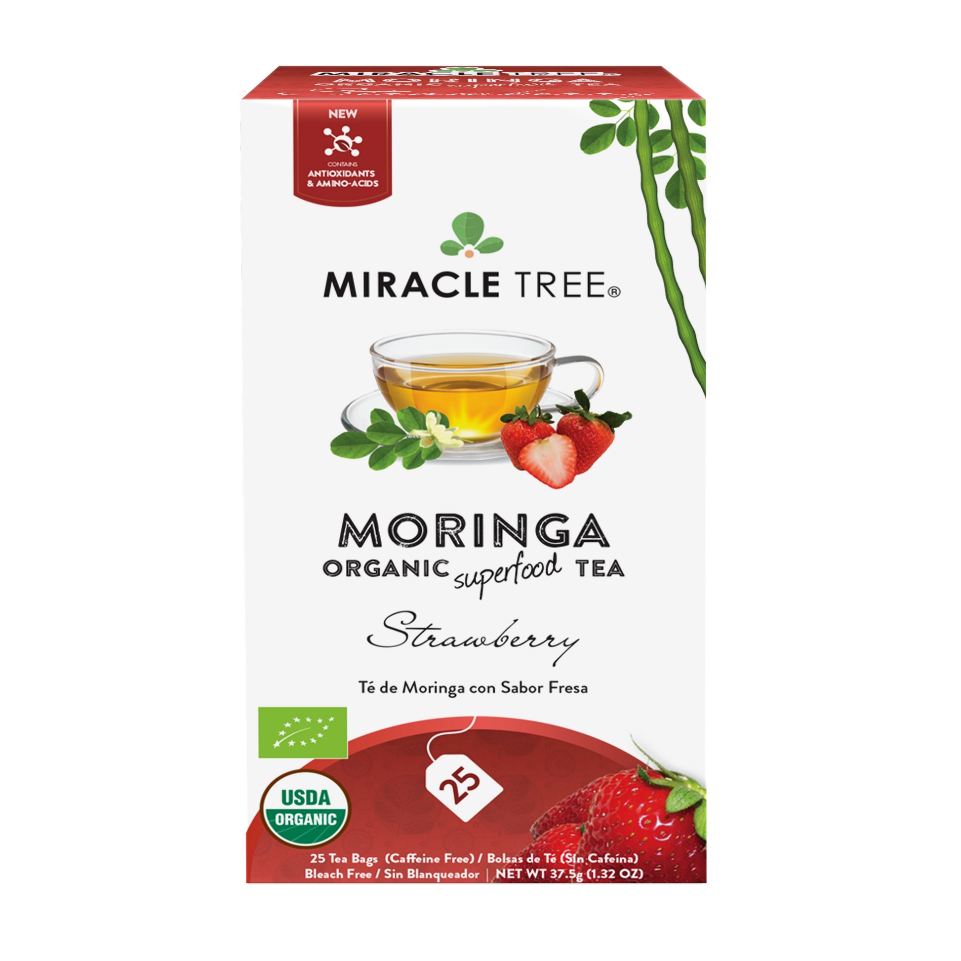 Miracle Tree's Strawberry & Organic Moringa Superfood Tea is an subtly aromatic strawberry infusion, which blends the sweetness of strawberry flavor with Moringa dried leaves to result in a fun and fruity flavor for a tasty and refreshing drink.